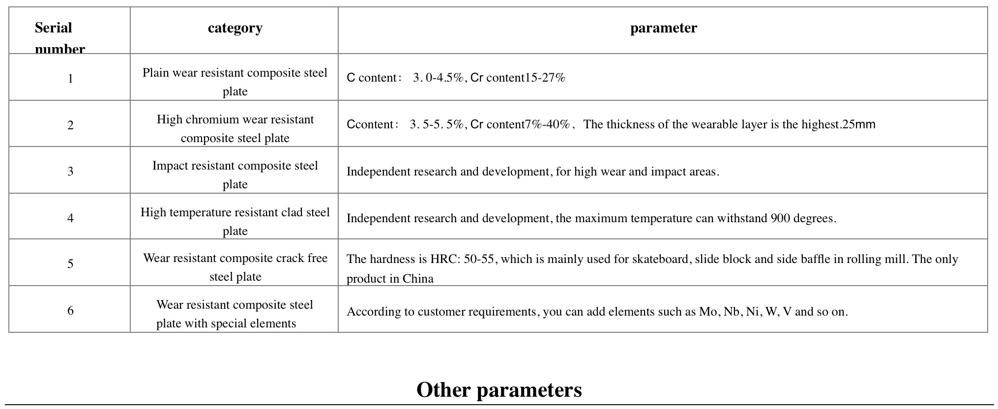 Chemical composition: Wear-resisting clad steel plate is a wear-resisting alloy coated with one or more layers of chromium carbide hard particles on medium and low carbon steel substrates, and some special elements are added to form carbides with special functions.